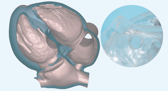 心房中隔欠損症を再現した心臓モデルです。透明素材を用いており、心腔内でのカテーテルの動きが外から確認できます。